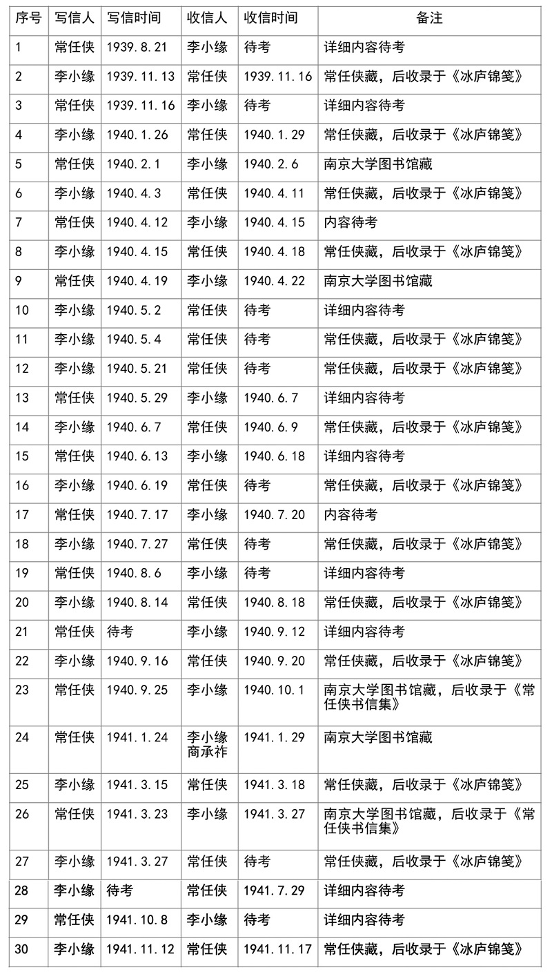 常任俠撰寫上信時,正身處重慶,李小緣先生則在成都,1939年至1940年間,川渝間通信尚算正常,平信基本一周左右遞達,而航空信更是只需三天左右便能送達。這從《常任俠書信集》、《冰廬錦箋》中往來書信也能看出,筆者結合《常任俠書信集》、《冰廬錦箋》兩書以及常任俠戰時日記,大致梳理了兩人書信往來情況,如下表所示: