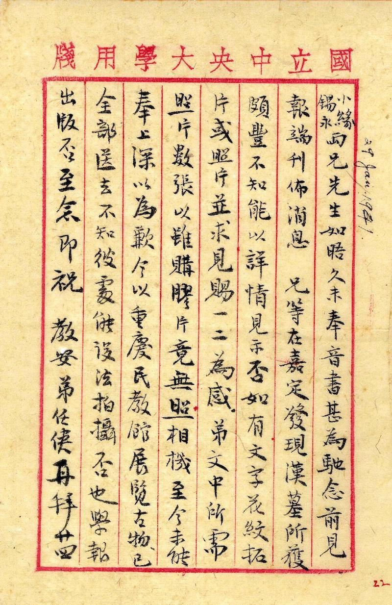 久未奉音書,甚為馳念。前見報端刊布消息,兄等在嘉定發現漢墓,所獲頗豐,不知能以詳情見示否?如有文字、花紋、拓片或照片,并求見賜一二為感。弟文中所需照片數張,以雖購膠片,竟無照相機,至今未能奉上,深以為歉。今以重慶民教館展覽古物已全部送去,不知彼處能設法拍攝否也?學報出版否?至念。即祝