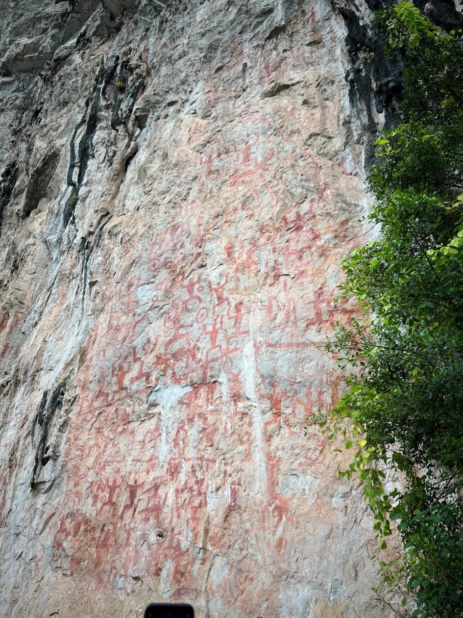“這是一棵黃花梨……你們看這棵樹上長的,都是野生的石斛……這里一叢叢都是鳳尾竹?!痹谌ネㄉ綆r畫的路上,朱秋平不停地為我們講解。三十年間不斷穿梭在這里,他早就熟悉了路上的一草一木。抬眼望,巖畫畫面底部距水面普遍有十幾米的高度,巖壁從上至下向內凹陷,很難想象壯族人的祖先駱越人在2000多年前是如何在這么高的崖壁上作畫的?!白畲蟮目赡苄允谴罴茏?,沿江兩岸的竹林茂盛,駱越人就地取材,以竹為架,留下了這些了不起的畫作?!毖卤谏嫌敏骷t色的顏料畫著各式各樣的人物、動物、器物等,這種顏料歷經千年的風雨依然鮮亮,我們至今無法完全得知這種顏料的具體成分。