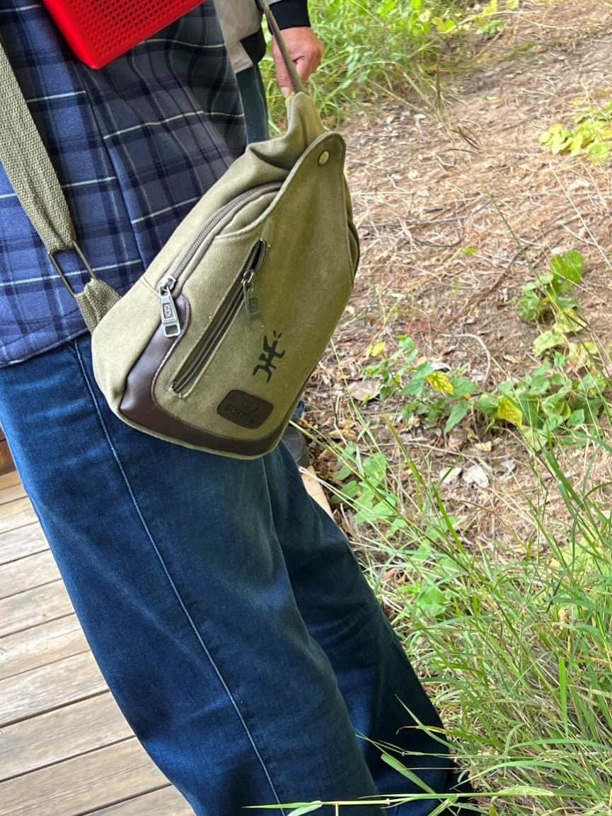 朱秋平隨身攜帶的小包上也裝飾著自己手繪的花山巖畫人物圖像