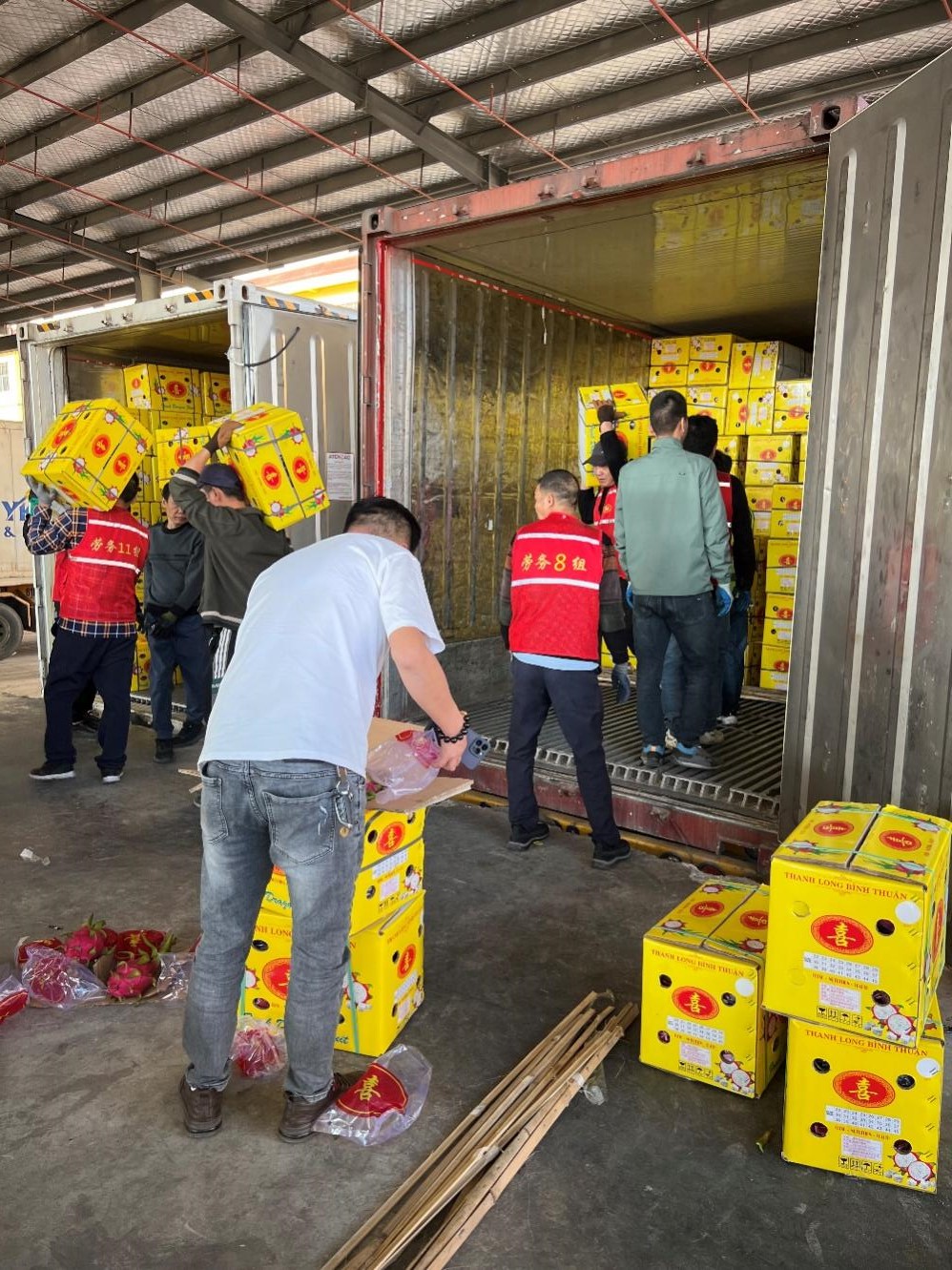 邊民裝卸隊正在將從越南運來的水果裝卸到國內的卡車上