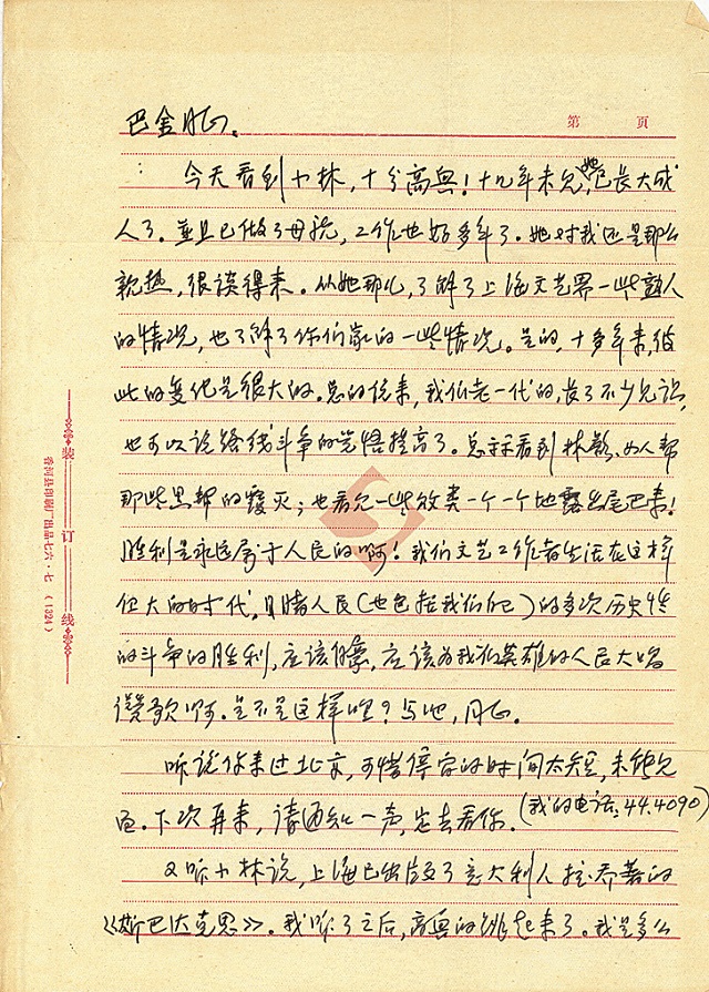 中國現代文學館館藏草明致巴金書信兩封