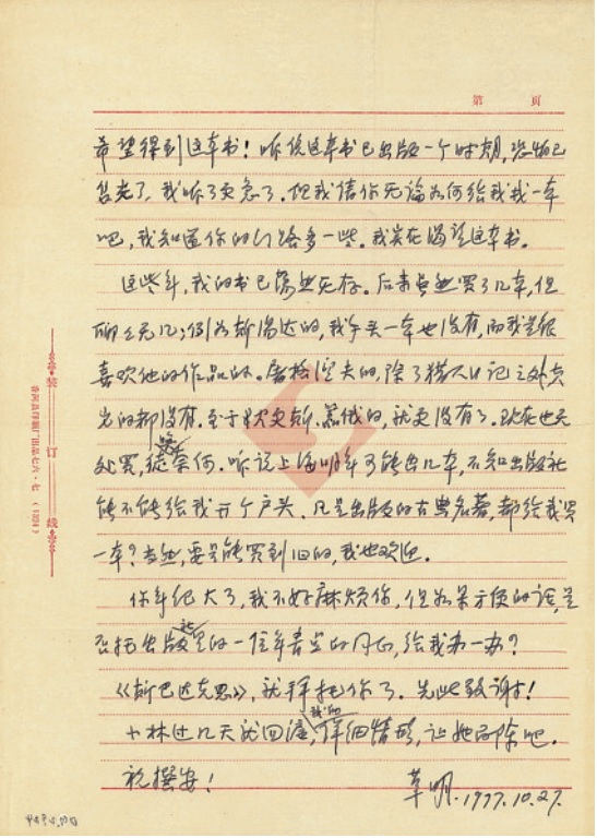 第一封:草明致巴金信 1977年10月27日