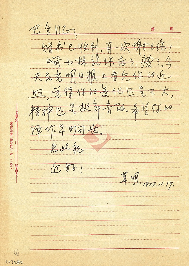 第二封:草明致巴金信 1977年11月17日