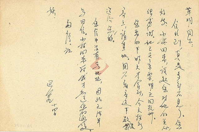“今天看到小林了,十分高興!十幾年未見,她已長大成人了。并且已做了母親,工作也好多年了。她對我還是那么親熱,很談得來。從她那兒,了解了上海文藝界一些熟人的情況,也了解了你們家的一些情況。是的,十多年來,彼此的變化是很大的??偟恼f來,我們老一代的,長了不少見識,也可以說路線斗爭的覺悟提高了??偹憧吹搅直?、四人幫那些黑幫的覆滅;也看見一些敗類一個一個地露出尾巴來!勝利是永遠屬于人民的??!我們文藝工作者生活在這樣偉大的時代,目睹人民(也包括我們自己)的多次歷史性的斗爭的勝利,應該自豪,應該為我們英雄的人民大唱贊歌啊。是不是這樣哩?寫吧,同志。