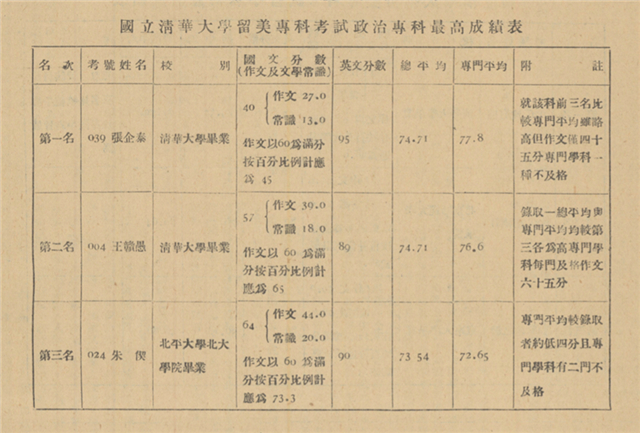 七月一日至八日,留美考試在清華和上海交大舉行,前五天筆試,后三天口試。報名的一百四十三人棄考、輟考者不少,最終一百零四人完成考試。七月二十五日,考委會議定正取十人,備取三人。正取名單中,文學楊業治、哲學沈有鼎、政治王贛愚、物理周同慶、化學袁翰青均系清華應屆畢業生,歷史郭斌佳和數學胡坤升為清華助教,只有心理馮德培、經濟梁慶椿、生物張宗漢三人來自外校。招考章程原為擇優錄取,即錄取成績最佳的十人,各門名額不限,每科取一人改變了規則??嘉瘯€以擴大留學機會為由,決定已考取其他留學考試者不予錄取,這也事先未說明。中央大學區當年六月下旬舉辦歐美官費留學考試,均為理工科,五名江蘇籍清華學生同時報考中大和本校。七月六日中大留學考試發榜,清華物理系施士元和化學系張大煜中選,二人也因此被排除在清華錄取之外。
