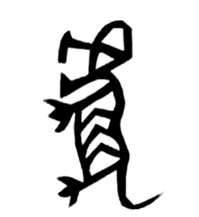 虎,在甲骨文里堪稱一副要素齊全的素描。老虎的頭、爪、身、尾一應俱全,而且非常準確地抓住了各部位的特征。巨口獠牙,利爪長尾,滿身的斑駁花紋,仿佛猛虎下山一般,威風凜凜,氣勢逼人。