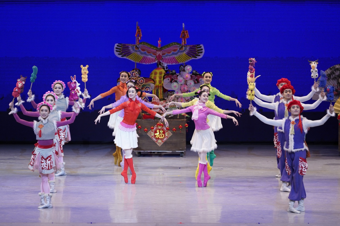 舞臺上,紅彤彤的燈籠、喜慶的春聯、熱鬧的廟會奏響了中國農歷新年的序曲;“團團”和“圓圓”家的年夜飯彰顯了中國禮儀之邦的待客之道、尊老愛幼的傳統美德,一張全家福更傳達了中國人對親情的重視和對團圓的向往;“胡桃夾子”大戰“年”獸,則充滿童趣地演繹了“過年”的傳說;而當寓意吉祥的仙鶴在蒼勁的松樹下迎著朝陽翩翩起舞——一幅“松鶴延年”的祥瑞畫卷中,西方芭蕾藝術在中國文化意象中煥發出了美妙的東方神韻;扇子舞、絲綢舞、糖葫蘆舞、風箏舞、陀螺舞、金元寶舞、瓷器舞,一派頗具中國元素的慶典場面讓阿聯酋觀眾游歷在瑰麗多姿的中國傳統文化藝術長廊中,在歡樂祥和、喜慶溫馨的氣氛中與“團團”“圓圓”一家共同迎接中國農歷新年的到來……