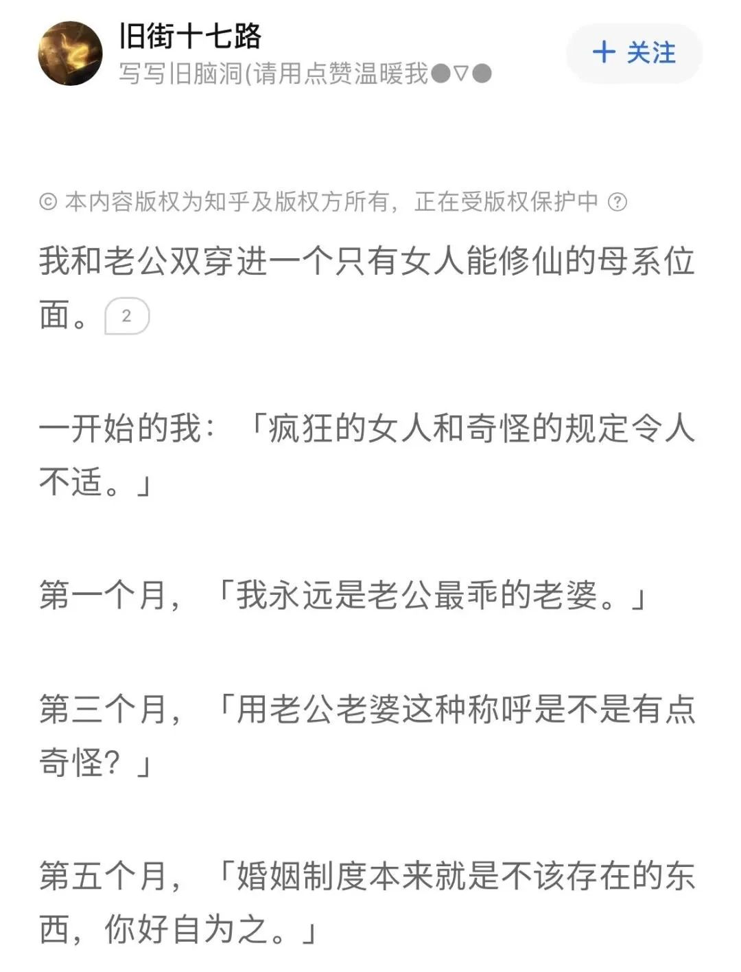 《走婚之后》一反“女尊文”強者為王的勝者邏輯和以暴制暴的叢林法則,繞開性別對立和冤冤相報的惡性循環,以性別地位倒置后的不平等,提出了接近性別平權的新路徑。于是,小說中倒置的性別地位帶來的不是爽文權力登頂的爽感,也不是甜寵文的自我安慰與沉溺,而是在迷霧與陷阱遍布的性別議題中提供了幾分清醒和指引。
