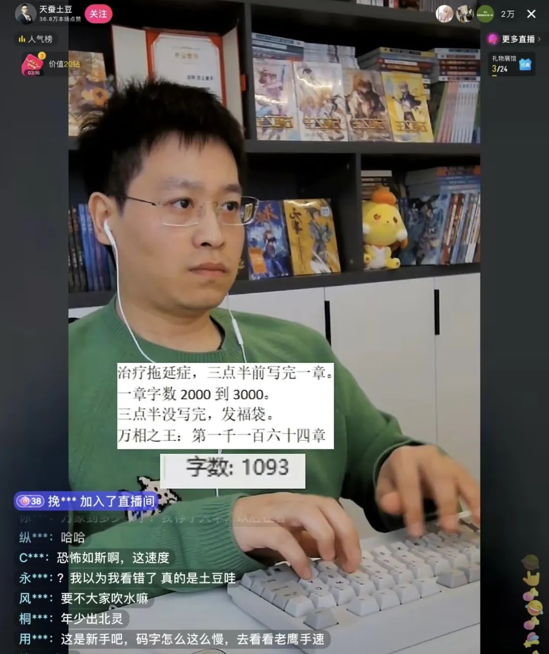 2月22日,天蠶土豆現身某短視頻平臺,直播寫網文,實時更新“碼字”字數。直播屏幕上,天蠶土豆打出了“改掉重度拖延癥,兩個半小時寫一章,一章字數2000到3000。兩個半小時沒寫完發福袋,請大家監督?。?!”的字幕條,并全程播放。該場直播歷時約兩小時,共吸引約2萬名網友在線“監工”。不久,天蠶土豆直播寫網文的消息登上熱搜,引發網友熱議。在直播頁面,眾多網友留下了這樣的調侃留言。