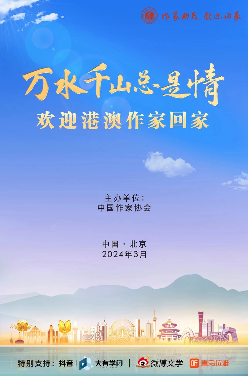3月28日-4月1日,“萬水千山總是情——歡迎港澳作家回家”作家活動周將作為中國作協“作家朋友 歡迎回家”系列2024開年首場活動在北京舉行。來自香港、澳門特別行政區的43位作家、詩人、劇作家、文化界人士將通過名家座談、對話、參觀、故事分享等多種方式與內地作家、學者、文學刊物主編、影視界人士共話文學的“海闊天空”和“光輝歲月”。