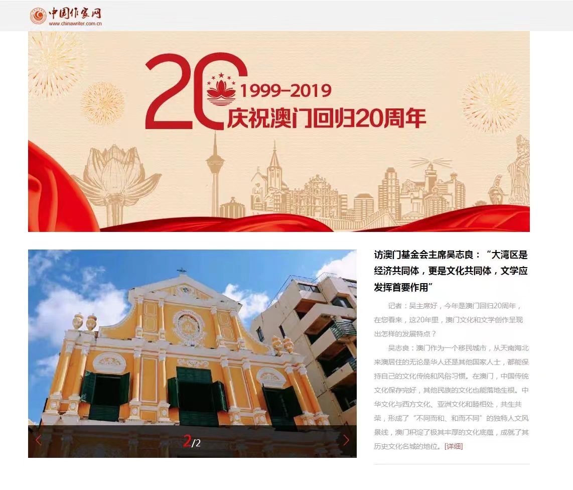 2019年,為紀念澳門回歸20周年,中國作家網開設“慶祝澳門回歸20周年”專題,以綜述、評論、訪談、創作談、作品等欄目,全方位展示澳門歷史文化以及當代文學創作圖景。這是一次對澳門文學的系統梳理。