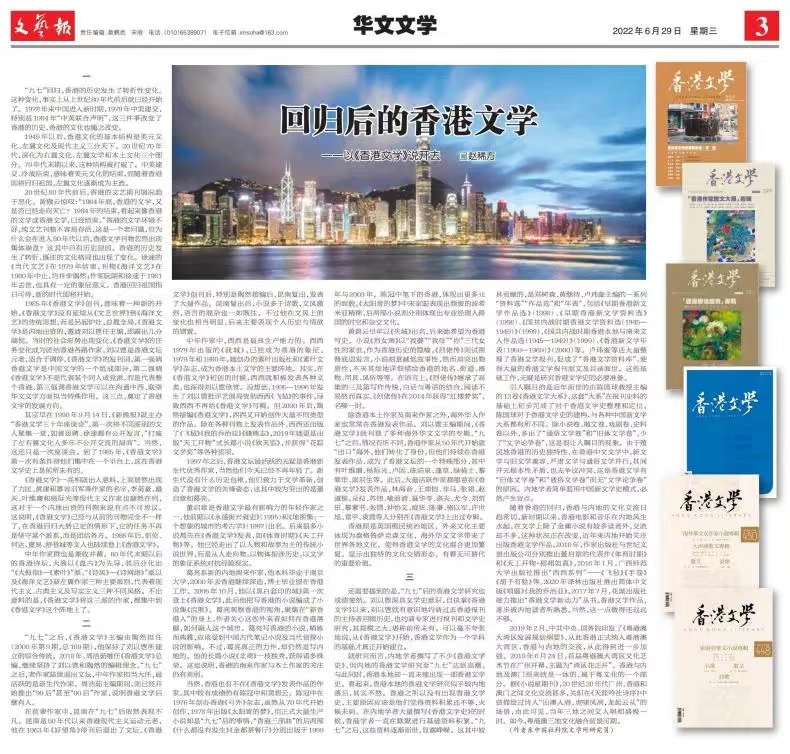 《文藝報》關注香港文學期刊所發揮的作用。2022年6月29日刊發社科院文學所研究員趙稀方所撰的《回歸后的香港文學——以<香港文學>說開去》一文。
