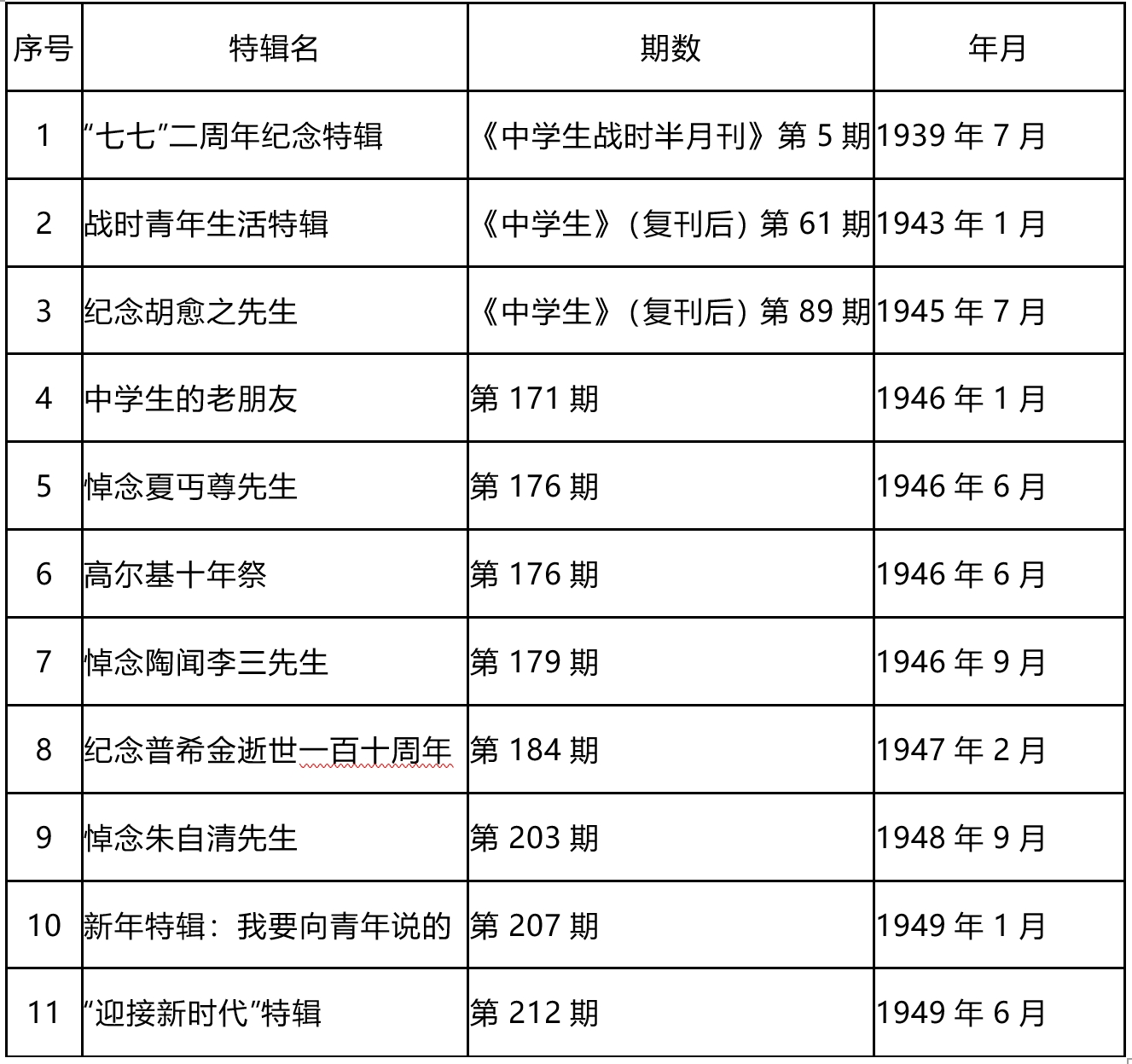與1937—1949年的歷史互為表里,《中學生》“特輯”如下: