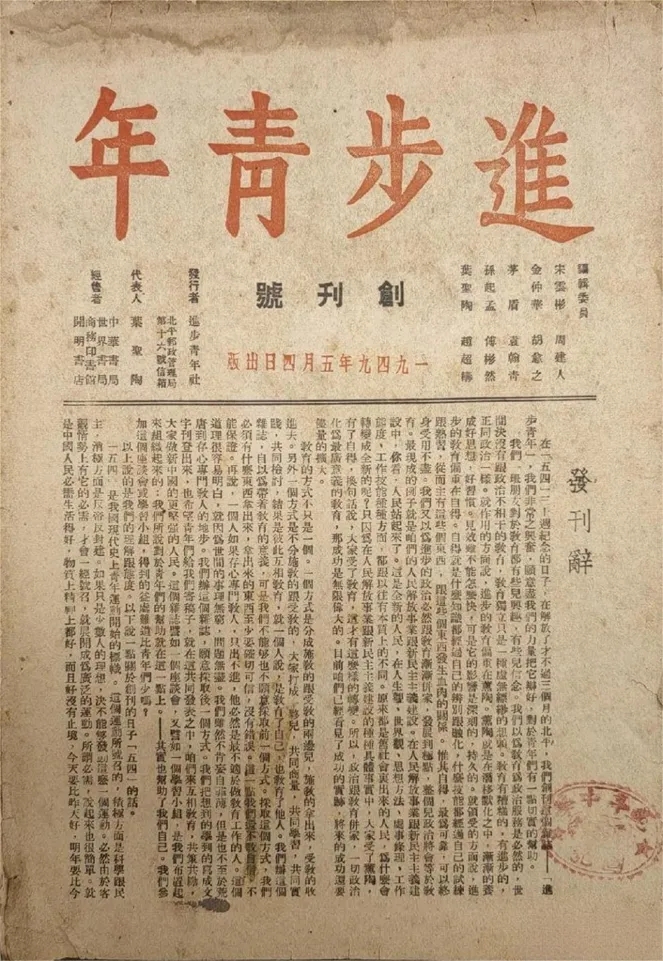1949年5月4日,《進步青年》在北平正式發刊,發刊辭摘要如下: