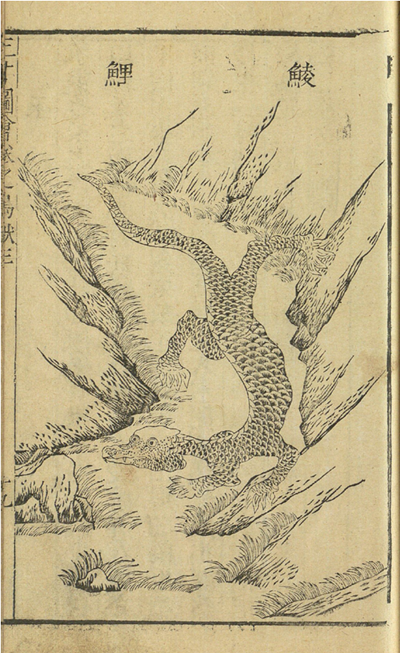 《山海經》記載的說鯥其狀如牛,所以《山海經》的插圖都把鯥畫成牛的樣子,到明清時期直到晚清時期的一些畫里面,又把穿山甲畫得像揚子鱷。為什么穿山甲后來又變成鱷魚了呢?這依然跟書的記載有關系,因為到了宋代以后的古書上都說穿山甲長得像鱷魚一樣。宋代羅愿的《爾雅翼》說,“鯪鯉,四足,似鼉而膽小”,鼉就是揚子鱷,南方人叫它豬婆龍,李時珍《本草綱目》也說,“鯪鯉,狀如鼉而小”,都把穿山甲比作揚子鱷,所以后來的人畫穿山甲就畫成了鱷魚。大家看這兩幅畫,左邊這幅就是見于一本古書,一本明代古書,叫《三才圖會》,它里面就畫有穿山甲,你看它上面寫著“鯪鯉”,這是穿山甲,你看他畫的就一個爬行動物嘛,與其說是穿山甲,不如說更像鱷魚。