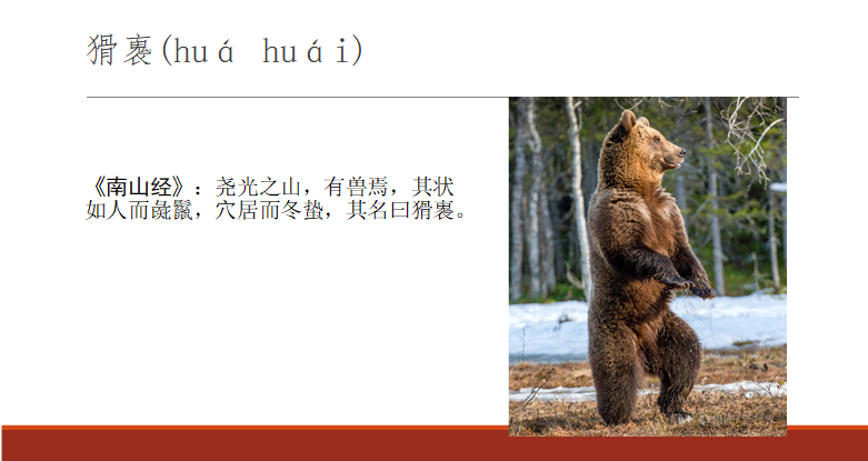 《南山經》說:“堯光之山,有獸焉,其狀如人而彘鬣,穴居而冬蟄,其名曰猾褢,其音如斲木,見則縣有大繇?!眻蚬庵缴嫌蟹N野獸,樣子長得像人,長著跟豬一樣的鬃毛,住在洞穴里面,冬天要冬眠。這一看就是黑熊。黑熊會像人一樣站立,所以說它“其狀如人”。東北的狩獵民族鄂倫春、鄂溫克等,非常崇拜熊,他們依然把熊想象成人,敬若神明。