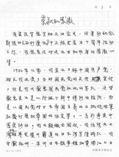 歲月荏苒,這篇由我保存了近40年的華君武“崇敬和感謝”征文稿,我準備在適當的時候捐贈給有關博物館、紀念館,讓千千萬萬的年輕人和參觀者從這一篇征文中,了解到埃德加·斯諾《西行漫記》一書的魅力,并從漫畫大家華君武與此書結緣的故事中,了解到近百年前那個烽火連天、洪流滾滾、英勇輝煌的歲月。