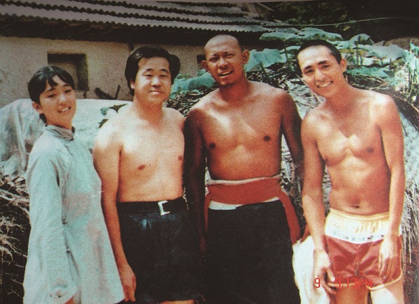 1987年,電影《紅高粱》拍攝時莫言與鞏俐、姜文和張藝謀合影