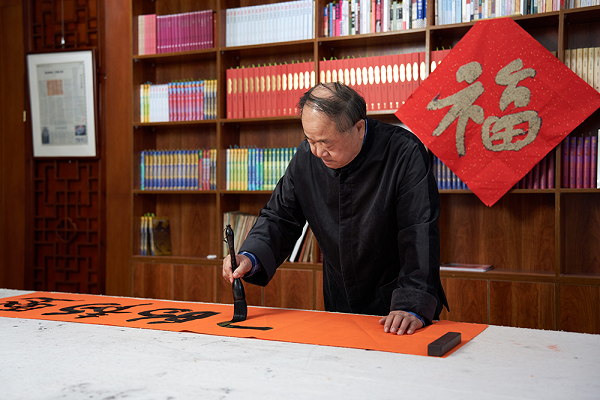 這些年,莫言愛上了寫毛筆字。寫毛筆字是一個可以忘掉時間的活動,它跟寫小說不一樣,一旦進入情境,就像打撲克摸牌似的,總感覺下一張會比上一張好。這樣寫著寫著,即使一直站著,他也不覺得累。