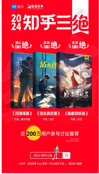 4月18日,經過近200萬用戶參與討論推薦,以口碑、圈層影響力和IP開發潛質為評選標準,《胤都異妖錄》《河清海晏》《活在真空里》三部短篇故事入選“新知乎三絕”名單?!靶轮跞^”的誕生,也標志著知乎鹽言故事進入作品規?;?、品類多元化、作品IP化的全新發展階段。
