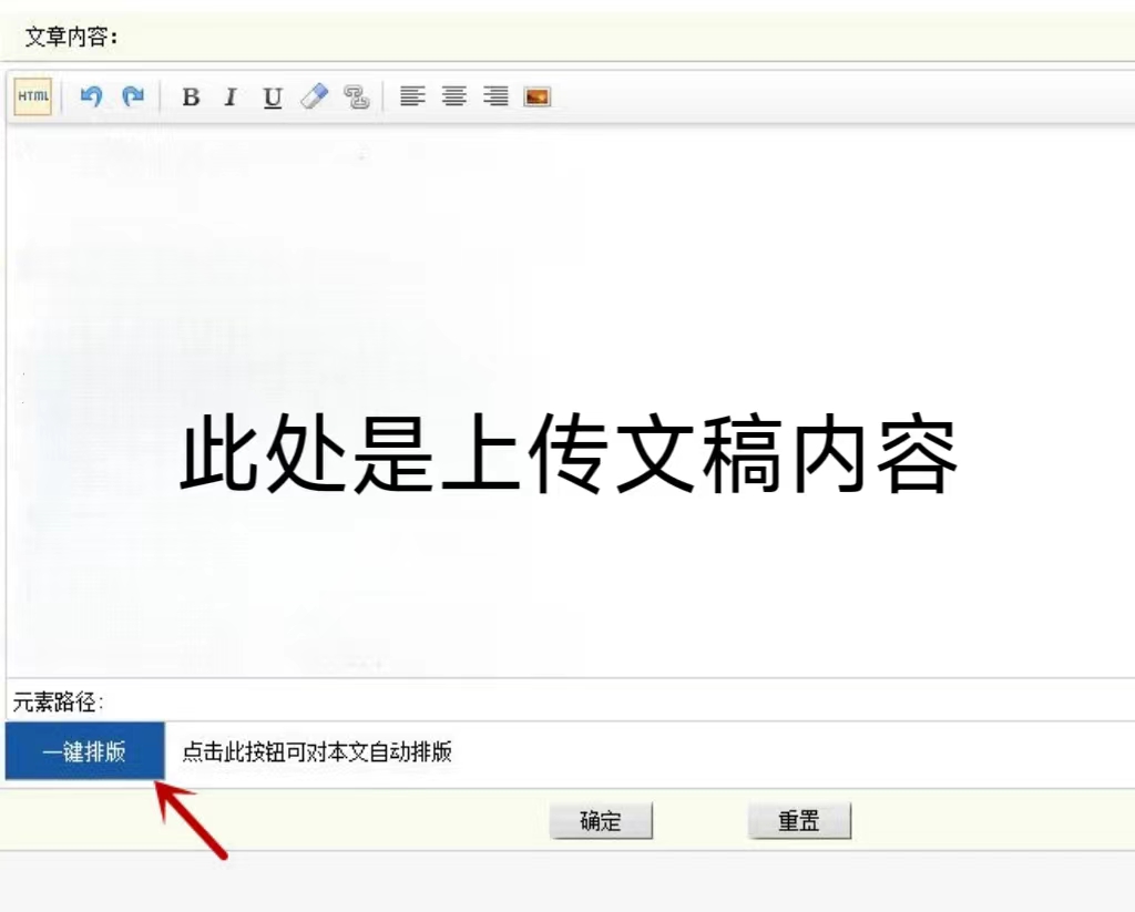 因原創投稿作品文檔中包含來源不明的外網鏈接的情況時有發生,嚴重危害網絡安全,為保障投稿、審稿工作順利進行,我們鄭重提示,自本公告發布之日起,所有投稿作品上傳時請務必進行“一鍵排版”操作(相關按鍵如圖中紅色箭頭指示)。此外,因詩歌格式特殊,進行“一鍵排版”操作后,請作者再根據具體情形調整分行排版。