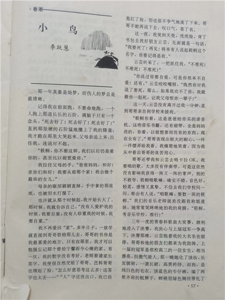 李躍慧的第一篇小說發表在《金沙江文藝》上,那時候她讀高一,喜歡聽歌,同學之間互贈的禮物常常是手抄歌詞,有耐心的連歌譜都抄上。她聽了趙傳唱的《我是一只小小鳥》,高亢嘹亮的歌聲傳遞出小小生命的無奈與倔強,深受感染,以此為題寫了一個小女孩的成長故事。稿子是語文老師幫她投的,小說發表后,語文老師把她和她的朋友叫到辦公室,一句一句給她們念編輯老師寫來的信。