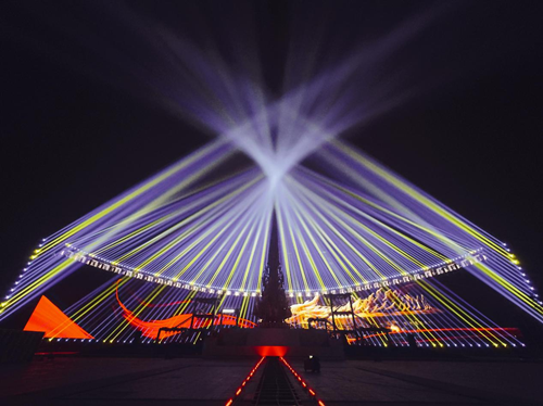 實景秀現場,近百名演員通過敲擊上百只形狀、大小各異的“破銅爛鐵”,上演一場別有風味的打擊樂表演──“破銅爛鐵打著玩”;老藝術家、《大海啊故鄉》原唱朱明瑛特別登臺,為唐山特別獻唱重新編曲過的新版《大海啊故鄉》,喻示“渤海明珠”唐山將擁有全新未來;最后,在《咱們工人有力量》的歌舞表演中,扮演唐山精神領袖李大釗的演員引領在場所有觀眾一同點亮“賽博版”唐山未來圖景。