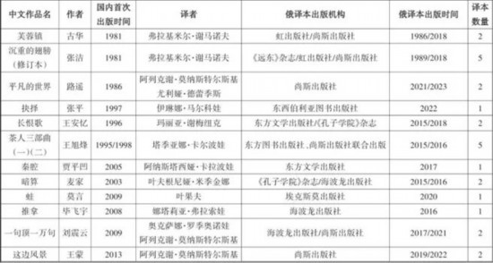 這一時期,“一批中國文學翻譯出版工程的實施,以及中國作家頻頻獲得國際大獎帶來的傳播效應,使中國當代文學作品在俄譯介工作開始升溫。中國政府的資助與俄方的商業運作結合,雙向發力促進了中國當代小說在俄羅斯的翻譯和推廣工作。長篇小說的出版數量躍升上新的臺階”。(3)在茅獎獲獎作品中,《長恨歌》《暗算》《推拿》《一句頂一萬句》通過中俄兩國政府間的人文交流與合作項目“中俄經典與現當代文學互譯出版項目”譯介出版,《秦腔》《蛙》《這邊風景》等也相繼在俄出版,而《芙蓉鎮》《沉重的翅膀》等曾經出版的作品也在這一時期再版。值得注意的是,第十一屆茅獎獲獎名單于2023年8月揭曉,獲獎作品《回響》已于同年6月經由漢學家奧莉加·羅季奧諾娃翻譯,通過海波龍出版社在俄出版,首發1000冊。(4)這部小說在獲得茅獎之前就先行在俄譯介出版,不僅說明了俄羅斯出版社商業嗅覺之靈敏,更反映出其對中國當代文學作品的關注度之高。