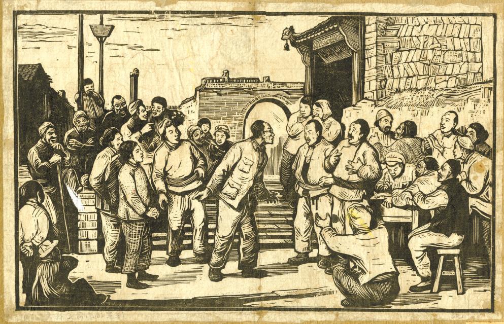 古元《馬錫五同志調解婚姻案》黑白木刻(1944年)