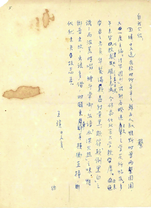 王瑤的自我介紹手稿(1987),刊于《為清華十級(1934-1938-1988)紀念刊》