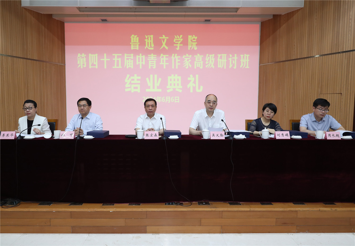 6月6日,魯迅文學院第四十五屆中青年作家高級研討班結業典禮在京舉行。來自全國各地的學員們圓滿完成為期3個月的學習研修任務,順利結業。中國作協黨組書記、副主席張宏森,中國作協黨組成員、副主席、魯迅文學院院長吳義勤出席結業典禮,并為學員們頒發結業證書。