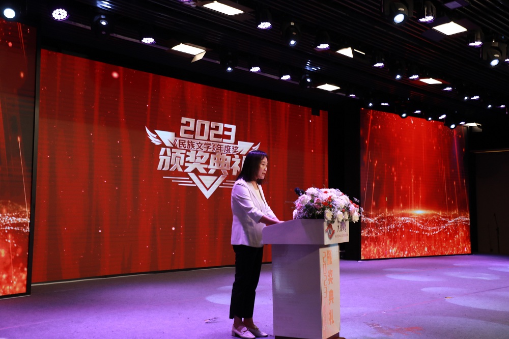 陳亞軍在致辭中談到,《民族文學》創刊四十多年來,始終秉持發展繁榮少數民族文學、團結少數民族作家、培養少數民族文學新人、促進民族團結進步的辦刊宗旨,以鑄牢中華民族共同體意識為主線,以構筑中華民族共有精神家園為己任,推出了大量優秀作品,培養了大量創作人才,相當一批少數民族文學名家大家從《民族文學》起步,走向全國乃至世界。她祝愿作家們以此次獲獎為新的起點、新的動力和新的激勵,以新視野、新境界,以超越的雄心、突破的勇氣和創新的手法,用情用力講好中國故事,描繪新時代城鄉崛起、山鄉巨變尤其是各族人民的嶄新精神風貌,向世界展現可信、可愛、可敬的中國形象,為實現中國式現代化貢獻少數民族文學力量。