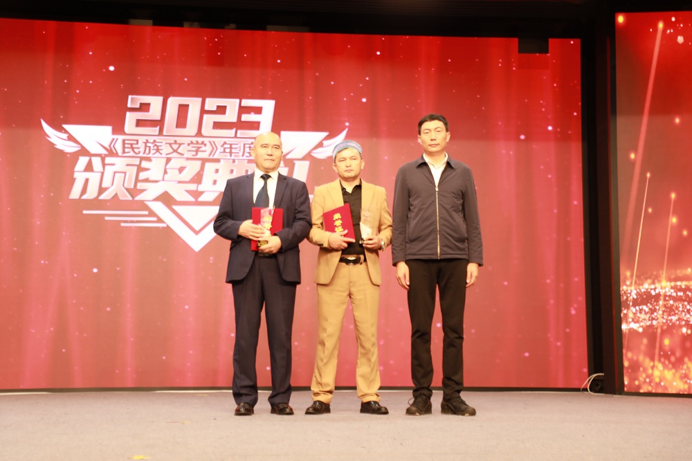 丘樹宏、魯若迪基為《民族文學》漢文版評論獎和新銳獎獲獎作家馬紹璽、巴燕·塔斯肯頒獎