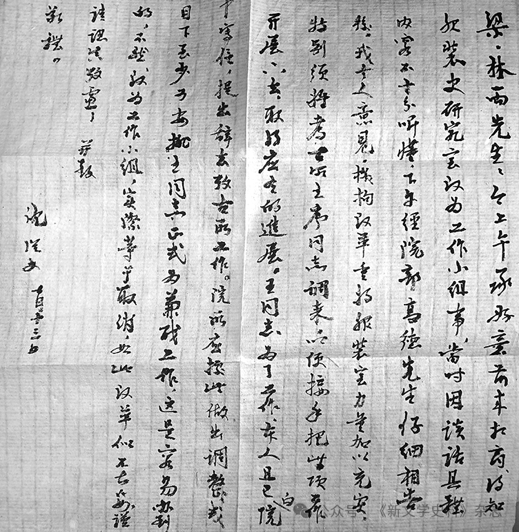 2022年,中國社科院古代史研究所籌辦研究所大師展,林甘泉先生之子林征先生提供了一封沈從文致梁寒冰、林甘泉的書信。該信未見發表,也未收入《沈從文全集》,信件內容涉及沈從文請調助手王?事宜,為我們考辨沈從文最后修訂《中國古代服飾研究》相關細節提供了幫助,也有助于我們更多地了解沈從文對服飾史研究和物質文化史研究投入的大量心力。
