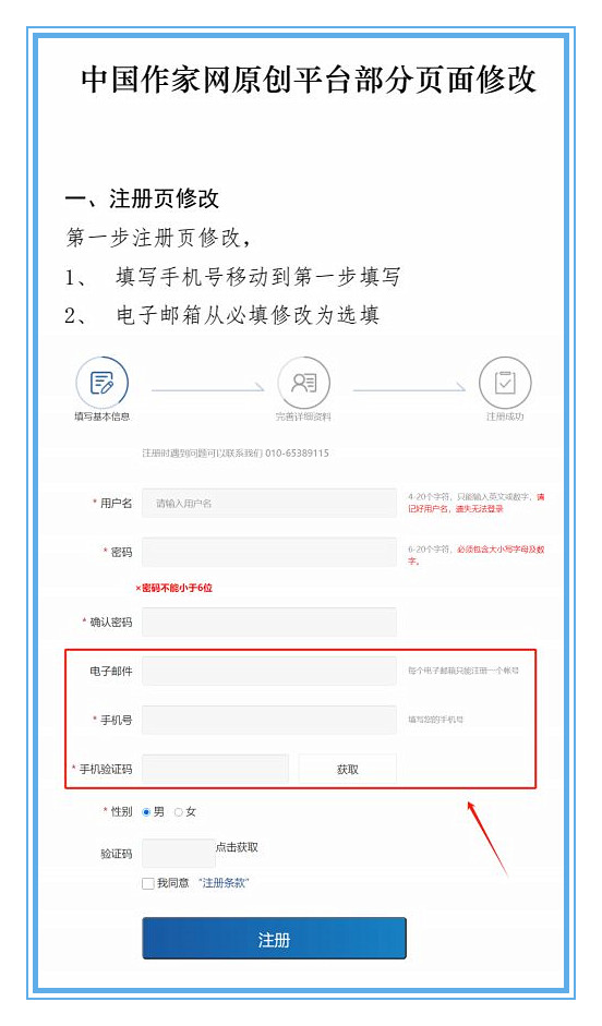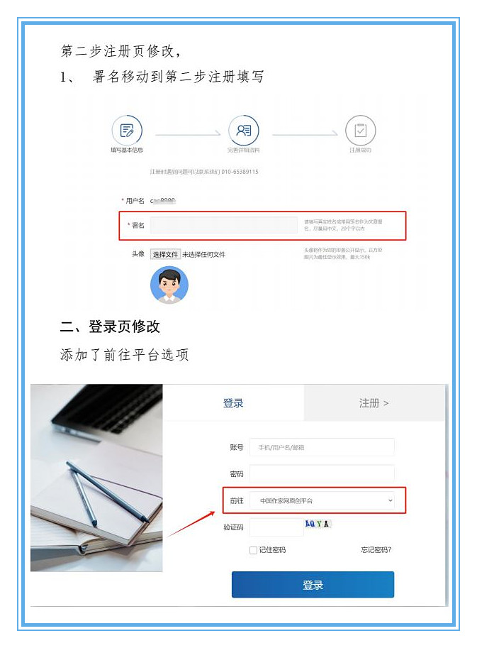 我們將于7月22日上線中國作協會員注冊系統,屆時原創平臺注冊和登錄頁面信息顯示會發生個別變化,但對注冊及登錄使用不發生影響。我們以圖片示例形式(見下圖一、二、三、四)將頁面變化公告如下,請知悉。