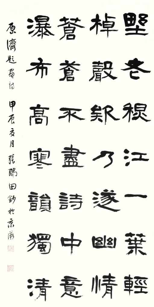 張瑞田長于隸書,他在漢隸端莊、沉雄的氣象里看到了傳統文化的深厚,勠力寫出無聲之詩。他的隸書樸素、簡約,抒情遣興,顯示出當代文人書法的獨特魅力。