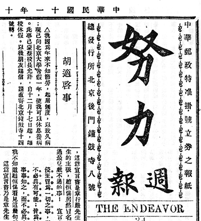 《努力》周報1922年12月24日刊載,胡適因病離校休養啟事