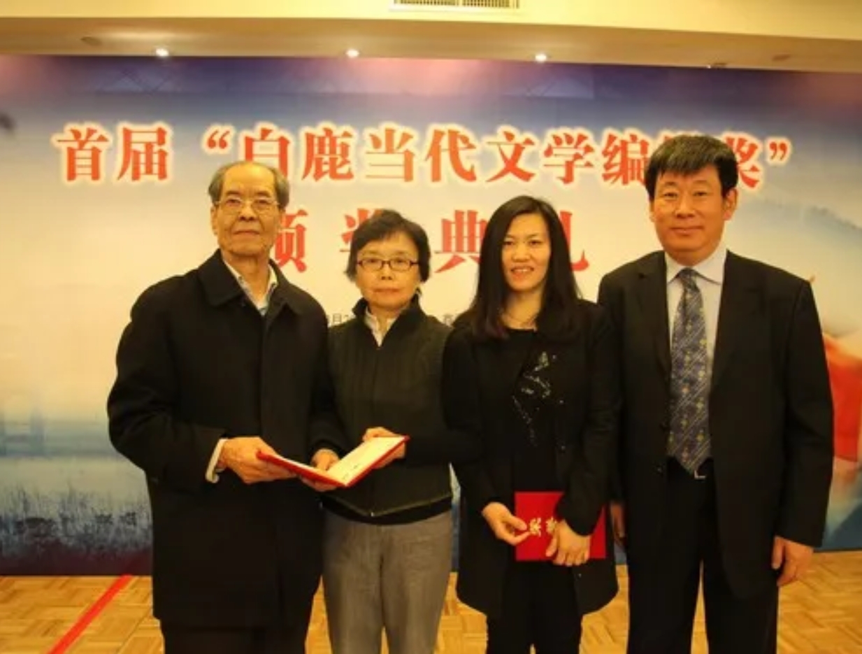忠實先生對編輯工作十分尊重,對過去在《白鹿原》編輯和出版過程中編輯的努力總是念念不忘。有一年,他提議用他的部分稿費作為基金,與人民文學出版社一起,設立一個“白鹿當代文學編輯獎”,以表彰人民文學出版社在當代文學出版工作中做出突出業績的編輯,我們當然欣然同意。首屆獎項除了設立了“正獎”,還特別設立了“《白鹿原》出版紀念獎”,對每一位在《白鹿原》編輯出版方面有過貢獻的編輯一一給予獎勵,以表達陳忠實先生對這些無名英雄的感激之情,由此也體現出陳忠實先生的高貴品格。這一舉動,在文學出版界,一時傳為佳話。這一次,陳忠實先生親自來京出席了頒獎會,我與忠實先生一起為獲“正獎”的兩位編輯頒獎,先生的臉上露出真誠的微笑。我與忠實先生還有兩位獲獎編輯的合影一直珍藏在我的相冊里……