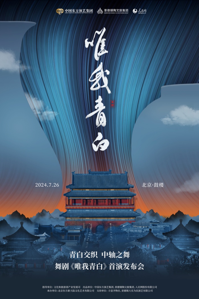 穿越千年,唯我青白。青白交織,中軸之舞。7月26日晚,由文化和旅游部產業發展司指導,中國東方演藝集團、景德鎮陶文旅集團、人民網股份有限公司共同出品的舞劇《唯我青白》首演發布會在北京鼓樓舉辦,以舞樂讓百歲鼓樓煥發新生,為北京中軸線申遺成功更添華彩。