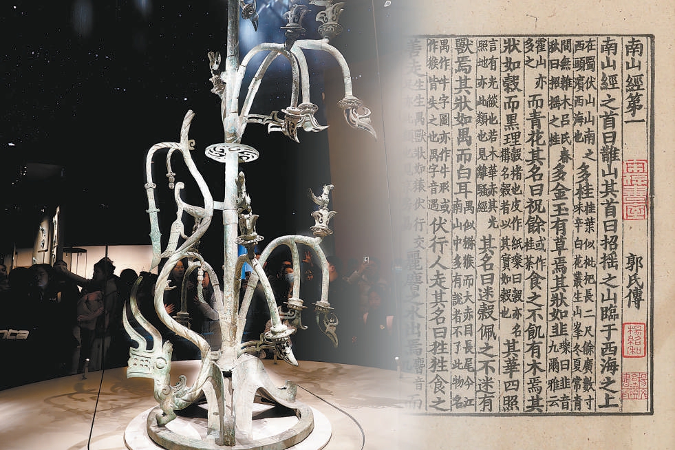 三星堆一號青銅神樹 新華社發 《山海經》書影