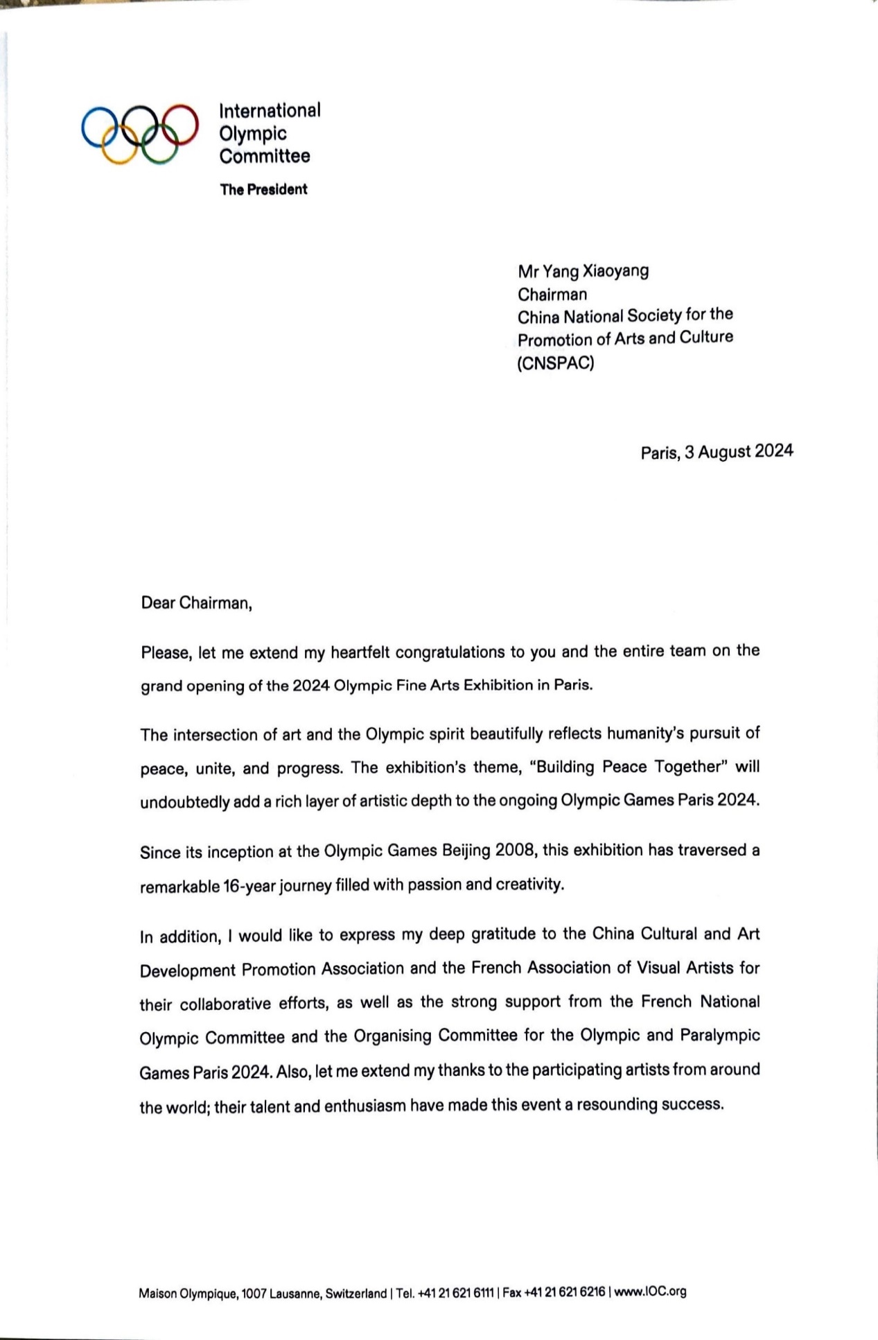 亞奧理事會副主席、體育委員會主席宋魯增宣讀了國際奧委會主席托馬斯·巴赫給中國文促會主席楊曉陽發來的賀信,他在賀信中談道:藝術與奧林匹克精神交相輝映,共同傳遞著人類對和平、團結與進步的追求。此次以“共筑和平”為主題的展覽,必將為正在進行的巴黎奧運會增添濃郁的藝術色彩。這項展覽品牌自2008年北京奧運會時期創辦以來,堅持走過了16年的歷程,這是一段充滿激情與創造力的征程。相信本次展覽必將成為奧林匹克藝術史上的絢麗華章。