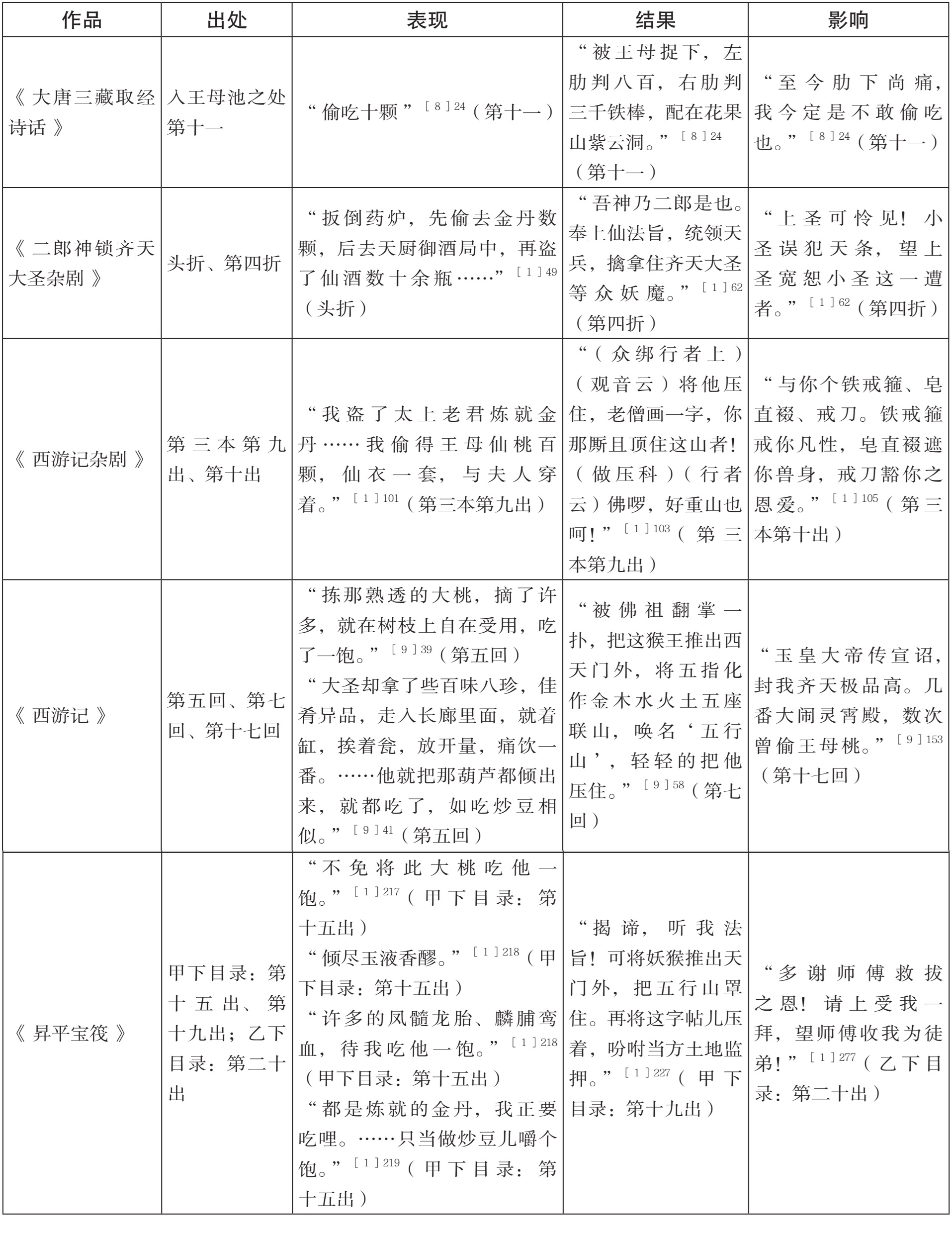 孫悟空的叛逆主要體現在對天庭理法的不敬——偷仙桃、盜御酒、鬧天宮等,但孫悟空的叛逆之性有所變化,可列表進行研究。
