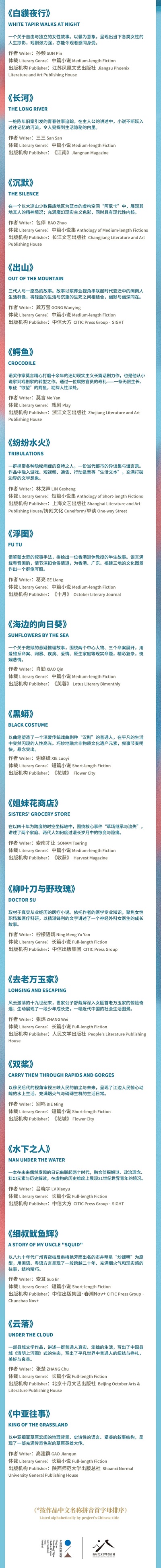最終入圍的推薦作品囊括近三年極具影視改編潛質且尚未進行任何影視化開發的文學精品,涵蓋懸疑、犯罪、科幻、愛情、歷史等多種類型。其中既有莫言的反腐題材長篇話劇力作《鱷魚》、葛亮描繪當代中年知識分子生存景觀的《浮圖》、張楚描摹中國縣城多元生態的《云落》、別鳴審視三峽人民前塵與未來的《雙槳》等現實題材作品,也包括多部類型小說佳作,如三三以知名刑事案件為原型創作的中篇懸疑小說《長河》;肖勤融合了命案、網暴、疾病和愛情的中篇小說《海邊的向日葵》;檸檬語嫣聚焦女性職場和醫療科研的長篇小說《柳葉刀與野玫瑰》等。