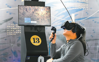 游客借助VR設備沉浸式游覽莫高窟第285窟虛擬場景。