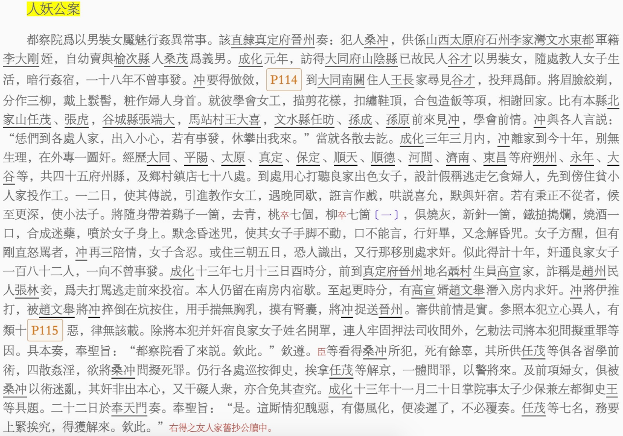 都察院以男裝女魘魅行奸異常事。該直隸真定府晉州奏:犯人桑沖,供系山西太原府石州李家灣文水東都軍籍李大剛侄,自幼賣與榆次縣人桑茂為義男。成化元年,訪得大同府山陰縣已故民人谷才以男裝女,隨處教人女子生活,暗行奸宿,一十八年不曾事發。沖要得仿效,到大同南關住人王長家尋見谷才,投拜為師。將眉臉絞剃,分作三柳,戴上鬏髻,妝作婦人身首,就彼學會女工,描剪花樣,扣繡鞋頂,合包造飯等項,相謝回家。比有本縣北家山任茂、張虎,谷城縣(引按:當為太谷縣)張端、大馬站村王大喜,文水縣任昉、孫成、孫原前來見沖,學會前情。沖與各人言說:“恁們到各處人家,出入小心,若有事發,休攀出我來?!碑斁透魃⑷ビ櫋苫耆聝葲_離家,到今十年,別無生理,在外專一圖奸。經歷大同、平陽、太原、真定、保定、順天、順德、河間、濟南、東昌等府,朔州、永年、太谷等共四十五府州縣,及鄉村鎮店七十八處……似此得計十年,奸通良家女子一百八十二人,一向不曾事發?!?/span>