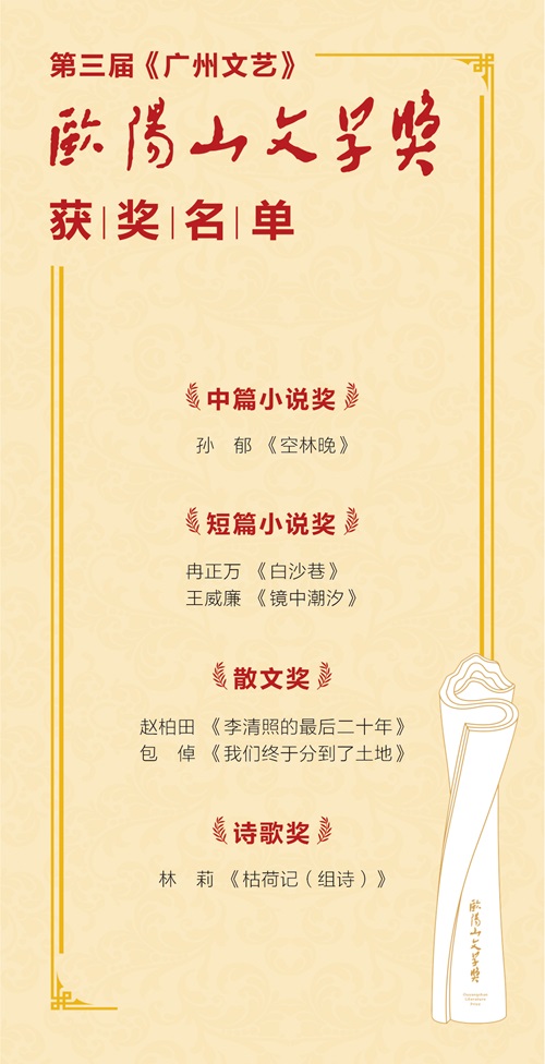 第三屆“《廣州文藝》歐陽山文學獎”獲獎作品于近日評出,《空林晚》(孫郁)獲中篇小說獎,《白沙巷》(冉正萬)、《鏡中潮汐》(王威廉)獲短篇小說獎,《李清照的最后二十年》(趙柏田)、《我們終于分到了土地》(包倬)獲散文獎,《枯荷記(組詩)》(林莉)獲詩歌獎。