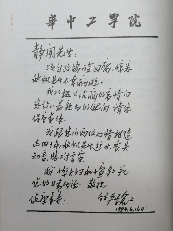 不過,或許因鐘敬文先生太長壽且交游廣泛,以致于他的學生們也弄不清楚嚴學宭究竟是誰。2018年出版的《鐘敬文全集》第十四卷《學術書信卷》中,收錄了嚴學宭致鐘敬文兩通信,只是釋文中的嚴學宭都錯成“嚴學宸”,末附《鐘敬文往來書信主要學者簡介》也不見“嚴學宭/嚴學宸”的蹤影。拋開這些疏誤來說,這兩封信對揭示嚴學宭與鐘敬文的交往頗有價值。其中一封唁函,是嚴學宭哀悼鐘敬文夫人陳秋帆(1909-1984)逝世的,寫于1984年6月16日,信中提及“我跟您們兩位心情相隨達四十年”,可見自1945年在中山大學相交以來,兩家人數十年來交情不減。