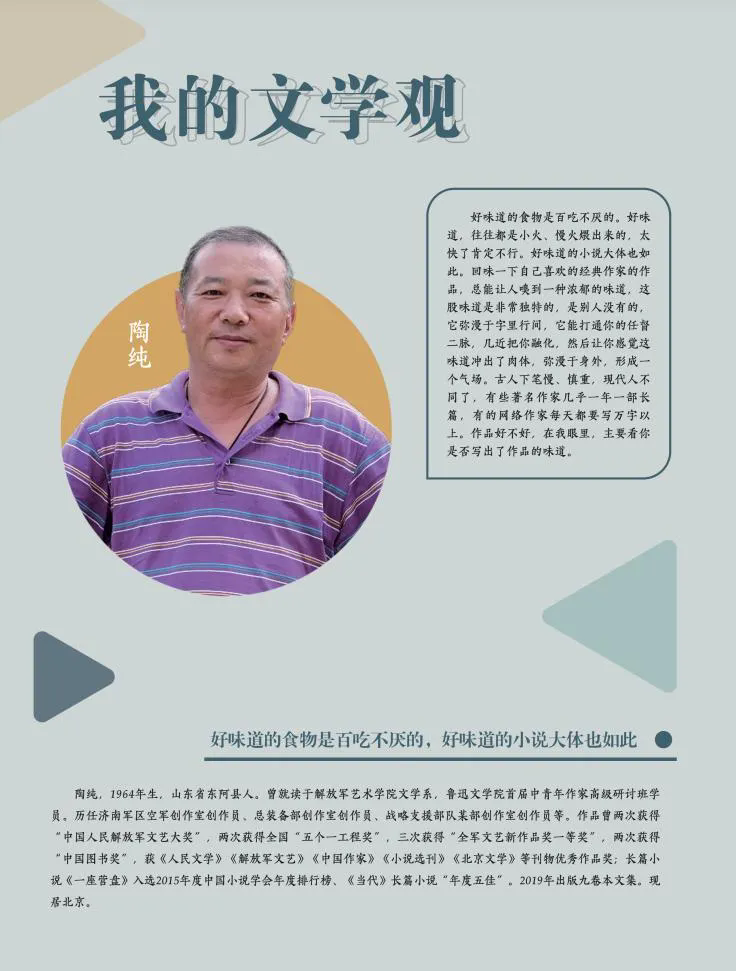 在《日久見真情》中,潘靈回顧了他與陶純 30 多年的深厚友誼,指出“路遙知馬力,日久見真情,這句話無論是之于人,還是之于文學創作,都是成立的”。張麗軍、李君君在《現實主義是中國大地上最好的文學風景——陶純小說論》中,系統解讀了陶純的小說創作,指出“他對現代文明沖擊下城鄉現實憂思并置的觀察、清醒而又客觀的批判,以及和平時期軍人形象的塑造、革命歷史文學表現領域的開拓,都讓我們看到了氤氳生成的大氣象?!痹趧撟髡劇恫蛔雠菽鍪印分?,陶純談道:“既然翻騰不起浪花,不如就做一顆水中的石子吧。石子不顯山不露水,靜悄悄地在下面趴著,多少年之后,泡沫沒了,或許石子還在?!边@是一種選擇,也是內心沉靜之人的文化自信。