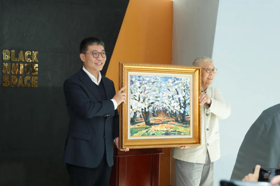 發言儀式后,鐵揚先生向母校捐贈畫作及十七種畫冊和文學類書籍。院長郝戎為鐵揚先生頒發捐贈證書、佩戴?;?。諸迪宣布展覽開幕。隨后,全體與會領導、嘉賓到展廳內參觀藝術展,并開展交流。